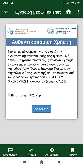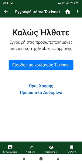 Για την εγγραφή σας, λοιπόν, στην Εφαρμογή, επιλέγετε το Εγγραφή μέσω Taxisnet. Στην συνέχεια πατάτε το Είσοδος με κωδικούς Taxisnet.